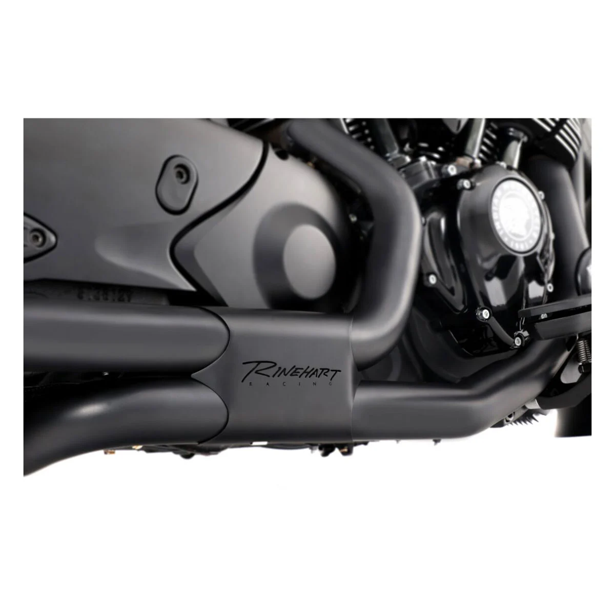 • The specially designed power chamber supplies equalization of back pressure to front and rear cylinders, which greatly improves bottom end power and torque, and is topped off with a sleek, laser-cut heat shield featuring the Rinehart Racing logo