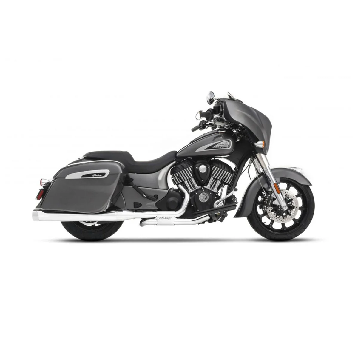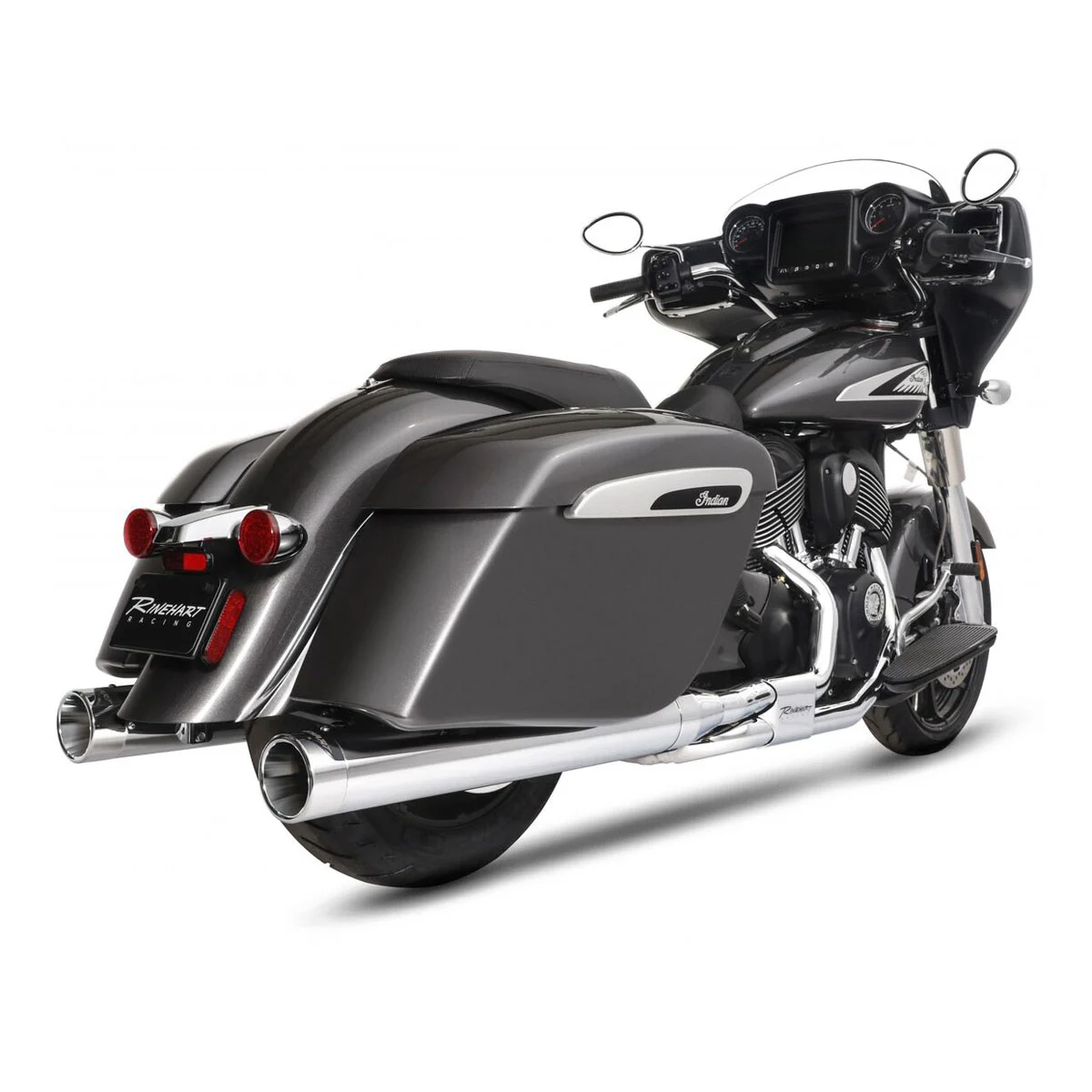 • The specially designed power chamber supplies equalization of back pressure to front and rear cylinders, which greatly improves bottom end power and torque, and is topped off with a sleek, laser-cut heat shield featuring the Rinehart Racing logo